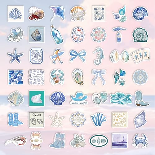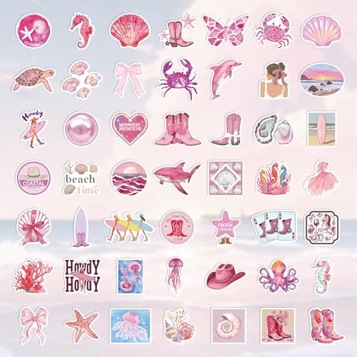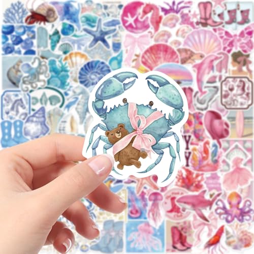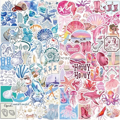 Calcomanías de niña costera de color rosa y azul: hay 100 calcomanías de vinilo impermeables de playa de océano diferentes paquetes de aproximadamente 2 a 3.5 pulgadas, hermosos patrones perfectos para regalo de niños y adultos. Pegatinas estéticas elementos de vaquera, adorables criaturas marinas, coral, playa del océano, conchas marinas y así sucesivamente.