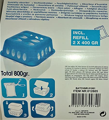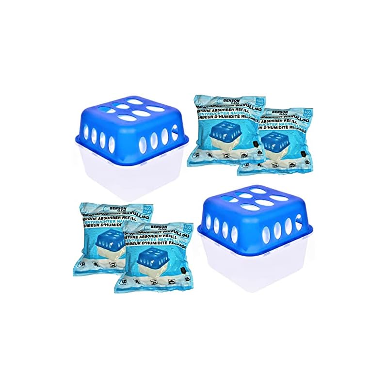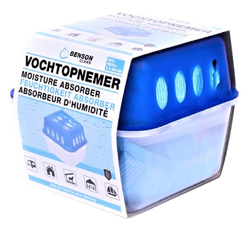 4 bolsas deshumidificadoras con 2 boquillas deshumidificadoras recargables. Absorbe la humedad, rellenable para deshumidificador. Evita la condensación, la humedad y los olores a humedad en el aire, paredes textiles, techos de automóviles. Con el proceso de deshumidificación instantánea, protege paredes, muebles, textiles o techo. También en la cocina o en el baño, el deshumidificador Cook absorbe el vapor y la humedad. Evita la condensación, la humedad y los olores a humedad. El eliminador de humedad pone fin a las habitaciones húmedas y húmedas y garantiza un espacio saludable reduciendo la humedad de la habitación. Ideal para diferentes usos, como casa, coche, caravana, cocina, baño o sótano. Reduce la humedad, protege contra el moho y los olores desagradables. No tóxico, inodoro y respetuoso con el medio ambiente. Con base ancha para un soporte seguro. El paquete incluye: 2 cajas deshumidificadoras con 4 bolsas de gránulos deshumidificadores recargables. Una bolsa absorbente de humedad puede durar de 2 a 4 meses antes de que deba rellenarse. Depende de la cantidad de humedad en la habitación.