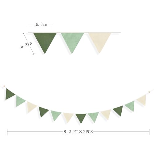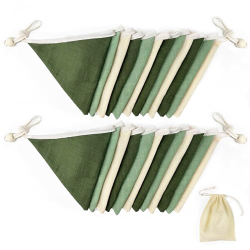 El paquete incluye: 2 guirnaldas de tela de lino verde de doble capa en colores verde oliva, verde salvia y crema, 12 banderas de 8.2 pies cada una, el total es de 16.4 pies. Longitud lateral de la bandera: 6.3 pulgadas. Cada cuerda tiene dos pequeñas cuentas de madera ensartadas en el extremo.