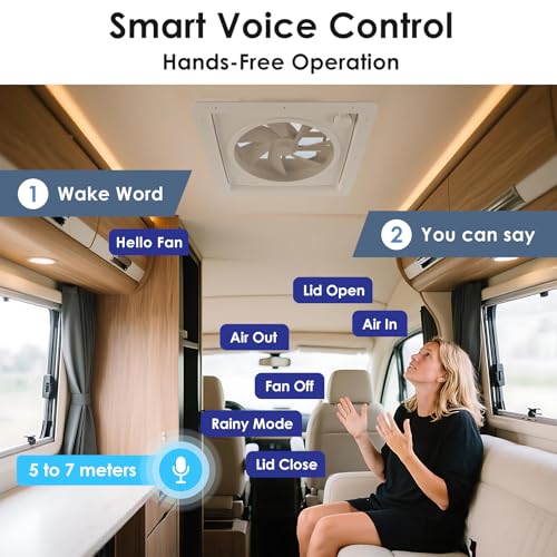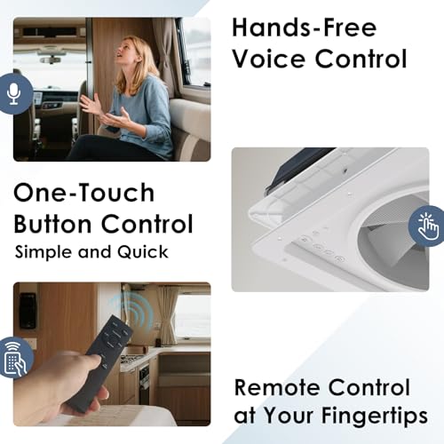 Especificaciones: 2012 Ventilador de ventilación de techo RV de 14 pulgadas con control de voz y luz LED de 4 colores, ventilador de escape inteligente reversible Air Max de 12 V a 24 V con control remoto y sensor de