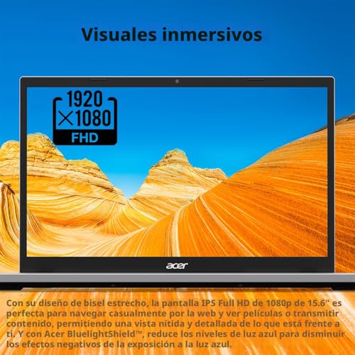 Visuales inmersivos: Con su diseño de bisel estrecho, la pantalla IPS Full HD de 15,6″ 1080p es perfecta para navegar por la web casual y ver películas o transmitir, lo que permite una visión nítida y detallada de lo que está frente a usted. Y con Acer BluelightShield, reduce los niveles de luz azul para disminuir los efectos negativos de la exposición a la luz azul.