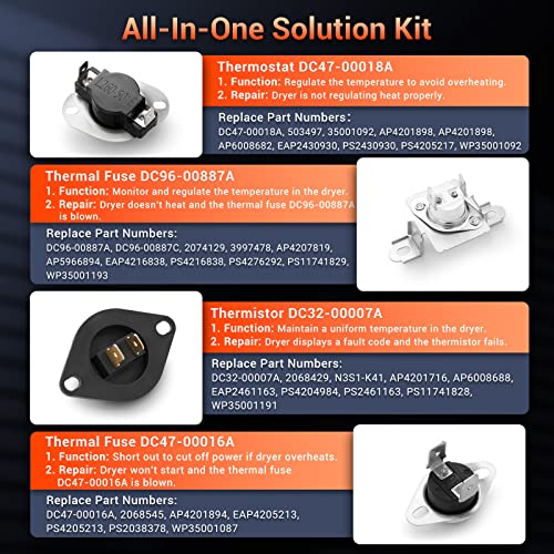Especificaciones: Actualizado elemento de calefacción para secadora DC47-00019A, DC96-00887A y DC47-00016A Fusible térmico, DC32-00007A Thermistor de secadora, termostato DC47-00018A, kit de reparación compatible con Samsung, figura 7 es compatible con modelos