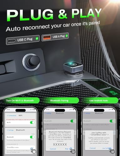 Especificaciones: Adaptador inalámbrico CarPlay 2 en 1 2026 compatible con Apple CarPlay y Android Auto, mini Bluetooth USB A y USB C Dongle Convertir con cable a inalámbrico Compatible con iPhone y Android