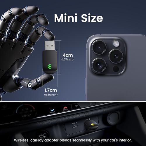 Adaptador Ultra Mini CarPlay: Este adaptador inalámbrico CarPlay cuenta con un diseño ultracompacto, pequeño y elegante, que se ajusta perfectamente al puerto USB de su automóvil y se mezcla perfectamente con el interior del automóvil, ¡no más desorden de cables! Con nuestro adaptador actualizado 2025, transforma sin esfuerzo el Apple CarPlay con cable de tu vehículo en una experiencia inalámbrica. Disfruta de funciones CarPlay perfectas como transmisión de música, navegación GPS y llamadas manos libres para una experiencia de conducción más cómoda