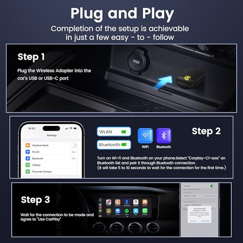 Especificaciones: Adaptador inalámbrico CarPlay para iPhone – Convertir con cable a inalámbrico, diseño mini USB, Plug & Play – Compatible con coches con Apple CarPlay – Incluye cable USB-C – Conexión rápida, sin