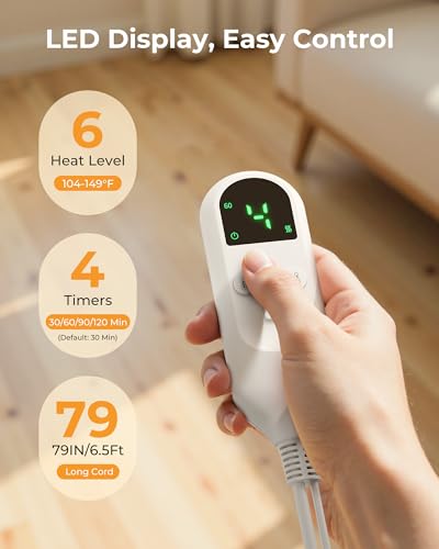 Alivio rápido, calor personalizado: Siente el calor en segundos con 6 niveles ajustables (104–149 °F) y 4 temporizadores (30–120 min, predeterminado: 30 minutos). Ya sea que prefieras un calor suave o un calor más fuerte, tienes el control: personaliza tu comodidad con un solo toque.