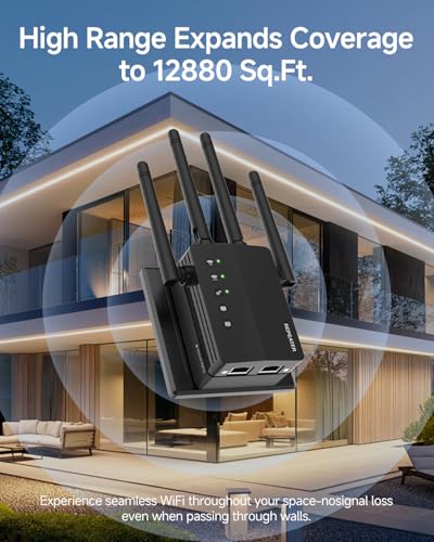 12880 pies cuadrados. ft Cobertura WiFi extendida: el extensor WiFi ayuda a ampliar su alcance WiFi hasta 12,880 pies cuadrados. pies, mientras que el amplificador de señal WiFi Extender para el hogar elimina las molestas zonas muertas, el almacenamiento en búfer y las videollamadas caídas.