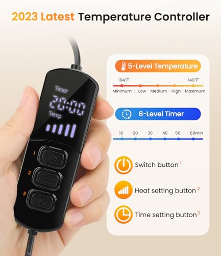El controlador fue diseñado para tener 5 niveles de calentamiento de 104 ℉ a 140 ℉ y 6 temporizadores de 10 minutos a 60 minutos. Fácil de usar y seguro para todas las edades.