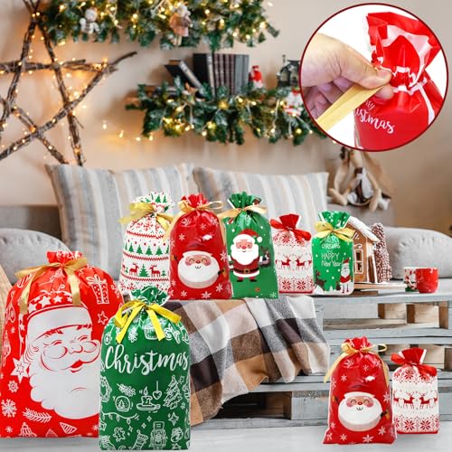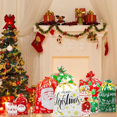 Diseño único de cordón: las bolsas de regalo de Navidad con cordón tienen un cordón en la boca de apertura, lo que hace que sea fácil de cerrar y abrir, protegiendo los artículos interiores y evitando que falten cosas, puedes omitir la molestia asociada con tijeras, cinta y cinta, ahorra tiempo y es muy cómodo. Perfecto para bolsas familiares de regalos de Navidad, bolsas de regalo de Navidad, bolsas de dulces, bolsas de golosinas, bolsas de juguetes, bolsas de golosinas, bolsas de golosinas, actividades de promoción de Navidad