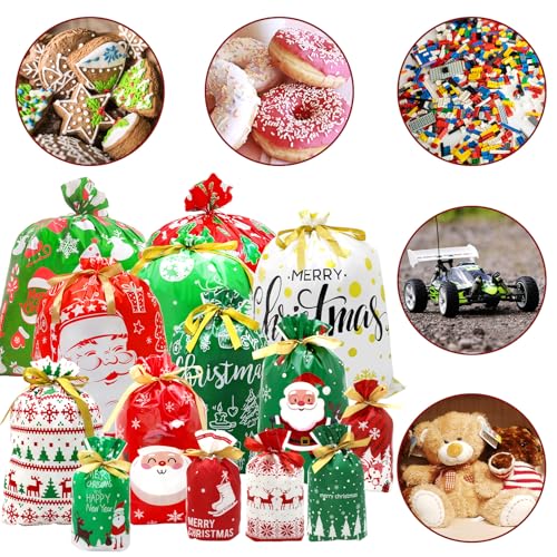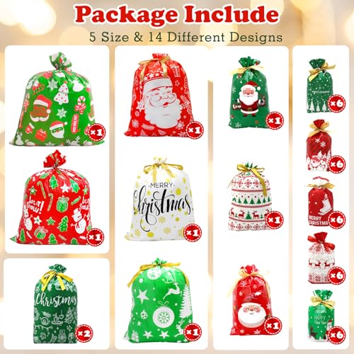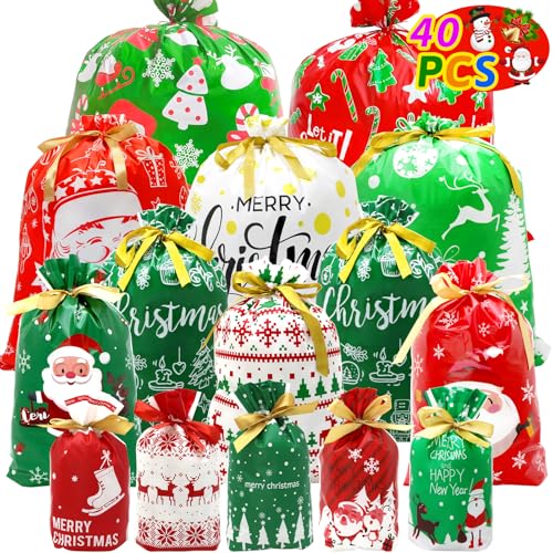 BCUEIDO 40 bolsas de regalo de Navidad con cordón de varios tamaños, bolsas de Navidad con cordón para regalos con etiquetas para regalos de Navidad, regalos de vacaciones, recuerdos de fiesta