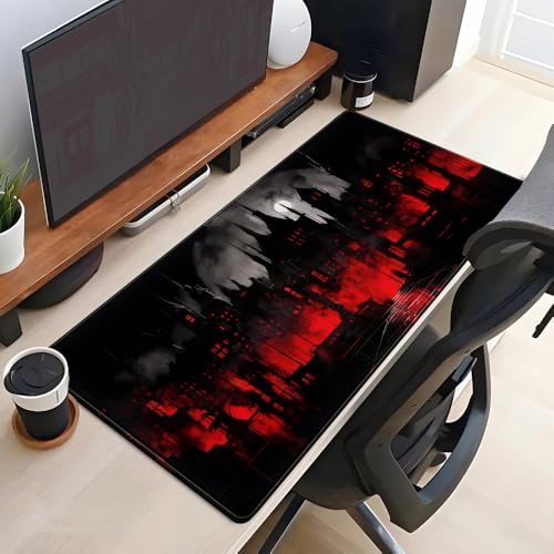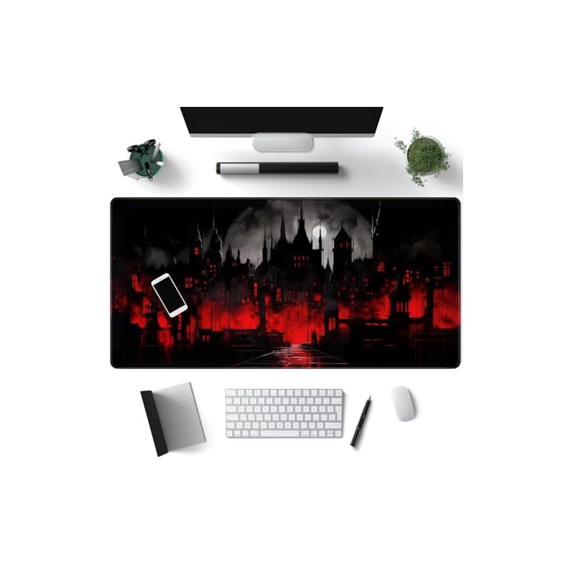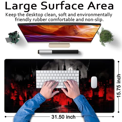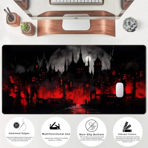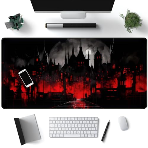Black Castle – Alfombrilla de mouse grande roja y negra, alfombrilla de juego, alfombrilla de juego grande para teclado completo y mouse pad para teclado con bordes cosidos, alfombrilla de escritorio