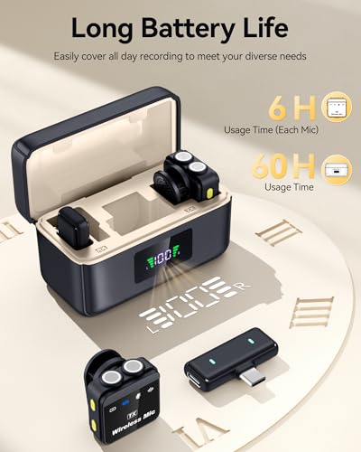 Tiempo de grabación largo de 60 horas: el micrófono inalámbrico Lavalier puede durar hasta 6 horas, y 2 micrófonos se pueden cargar de forma inalámbrica 3 veces a través de un estuche de carga para grabación de video. La combinación de micrófonos duales y un estuche de carga puede proporcionar suficiente energía para grabar blogs de video o realizar entrevistas, y el diseño es adecuado para viajar. El mini micrófono es fácil de poner en tu bolsillo o bolsa, por lo que no tienes que preocuparte por la batería baja, lo que es muy adecuado para creadores al aire libre.