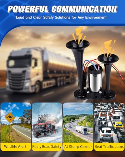 Especificaciones: Bocina de aire mejorada de 12 V 600 DB, trompetas duales, kit de bocinas de tren de camión súper ruidosas con compresor de aire para cualquier SUV de 12 V, motocicleta, camiones, camionetas