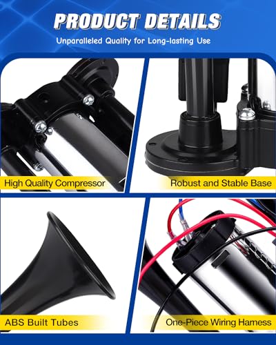 Duradero y fiable: nuestra bocina de aire está hecha de excelente zinc cromado y plástico ABS de alta calidad, que tiene las características de resistencia al agua, resistencia al desgaste y a la corrosión. Ya sea frente a malas condiciones climáticas o uso a largo plazo, nuestra bocina siempre ha mantenido un excelente rendimiento, por lo que no tienes que preocuparte. Pueden soportar la prueba del tiempo y el medio ambiente para brindarle una experiencia duradera y confiable.