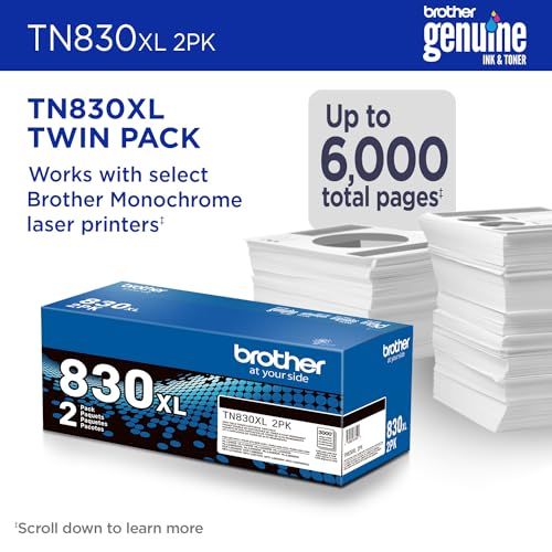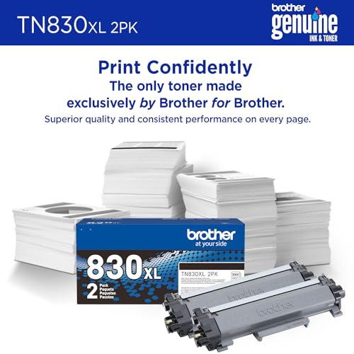 Imprime con confianza e imprime más con los cartuchos de tóner negro de alto rendimiento TN830XL 2PK de Brother originales, la opción conveniente para una impresión eficiente y de alto volumen en impresoras láser monocromáticas Brother (blanco y negro)
