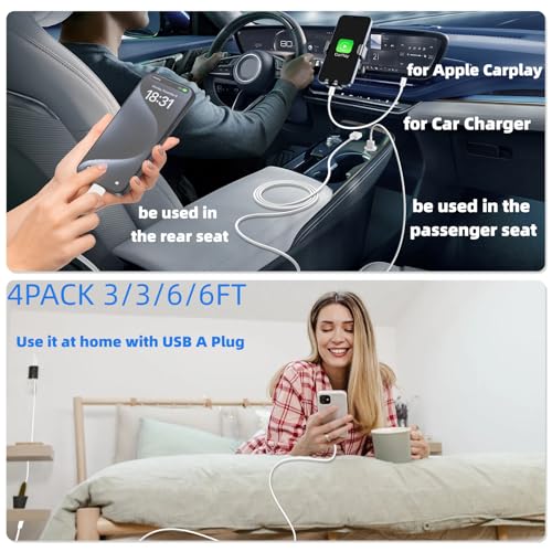 Cable para múltiples usos, cuatro tipos de carga: 1. Cable cargador para Apple Carplay. 2. Cable de carga para iPhone 17 16 15 para cargador de coche; 3. Cable de carga para iPhone 16 15 para cargador de pared USB A. 4. Cable cargador USB C para control remoto Apple TV (3ª generación), Apple TV 4ª generación, control remoto Siri (3ª generación), control remoto Apple TV 4K (3ª generación). Se puede utilizar en el automóvil, hogar, sala de estar, oficina, hotel.