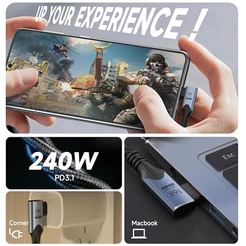 Entrega de energía de 240 W: Carga y conexión en uno: una solución de carga rápida de cable C a C, este cable usbc a usbc ofrece 240 W con PD 3.1. Reemplace varios cables con este cable USB-C a C: maneja la carga rápida, los datos a través del cable de transferencia de datos USB-C y video, simplificando su espacio con un potente cable usbc.