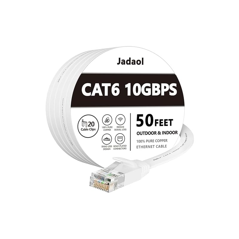 Especificaciones: Cable Ethernet Cat 6 de 50 pies, para exteriores e interiores de 10 Gbps compatible con red Cat7, cables de conexión LAN RJ45 de Internet, cable de computadora de alta velocidad Cat6 sólido con clips para enrutador, módem, PS4/5, Xbox, juegos, Blanco