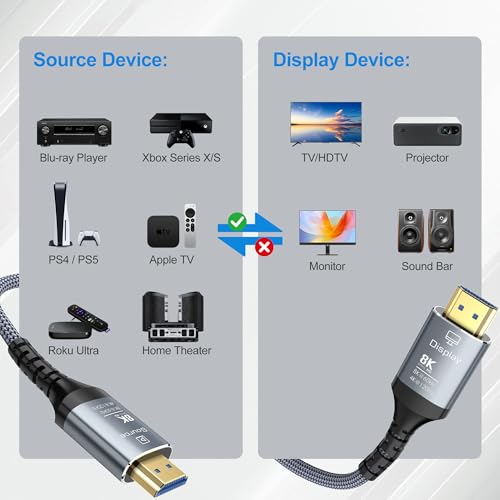 Transmisión unidireccional: el cable es unidireccional ya que son cables ópticos HDMI. Los enchufes en cada extremo están marcados como fuente/pantalla. Ten en cuenta que la fuente es la fuente de señal (portátil, PS5/PS4, Xbox, PC, reproductor de Blu-ray, etc.) y la pantalla es el extremo de la pantalla (monitor, TV, proyector, etc.), así que asegúrate de conectar cada extremo correctamente