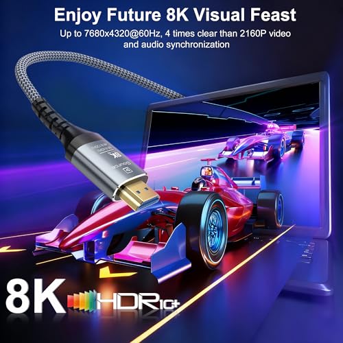 Especificaciones: Cable HDMI de fibra óptica 8K de 20 pies, 48 Gbps ultra alta velocidad largo HDMI 2.1 cable trenzado 8K @60Hz 4K @120Hz HDR10/HDCP2.2 y 2.3/eARC/3D compatible con PS5, Xbox, HDTV, laptop