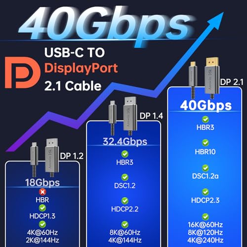 Especificaciones: Cable USB C a DisplayPort, 16K @30Hz, 8K @120Hz, 4K @144Hz, DisplayPort 2.1 nailon trenzado [compatible con Thunderbolt 3/4] para MacBook Pro, iPad, Dell XPS, iPhone 16/15, Galaxy S25