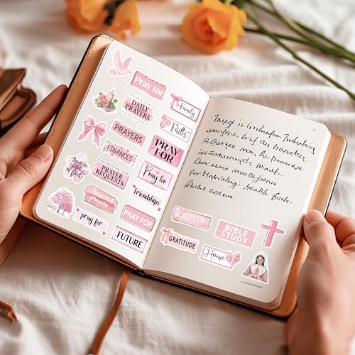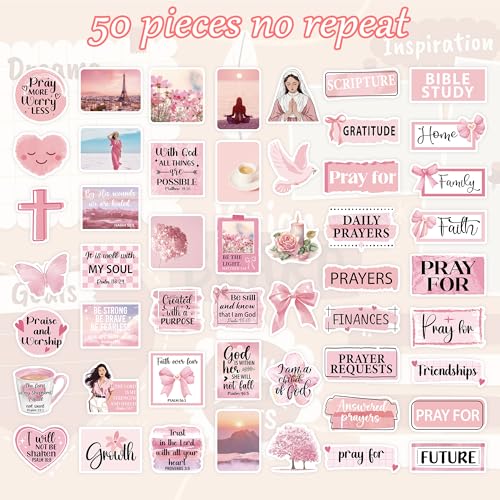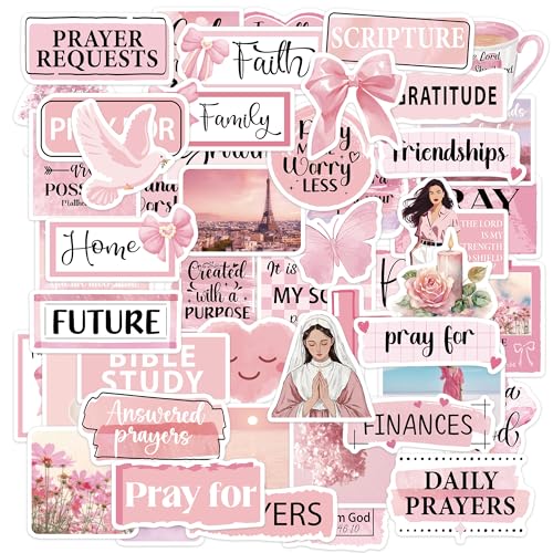 Calcomanías de la Biblia de tablero de oración rosa, 50 calcomanías inspiradoras, calcomanías de oración para tablero de visión, diario, álbum de recortes, taza para laptop, citas motivacionales