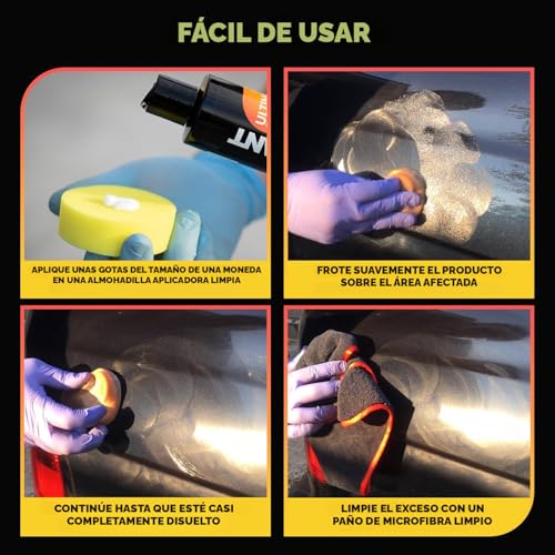 Fácil reparación de arañazos y remolinos: si tu automóvil tiene arañazos ligeros, remolinos u otras marcas, puedes arreglarlo fácilmente con nuestro kit de eliminación de arañazos y remolinos. Con el uso de la almohadilla pulidora incluida, nuestro compuesto especialmente formulado te permitirá eliminar y “borrar” fácilmente años de desgaste de la pintura de tu vehículo y aspecto general. (Ten en cuenta que si tienes arañazos muy profundos que se pueden sentir fácilmente con la punta de la uña, el producto puede no ayudar tanto).