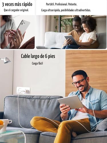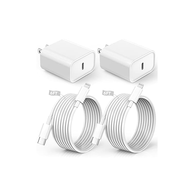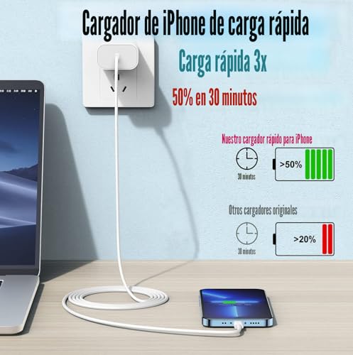 Paquete de 2 cargadores de iPhone de carga rápida: nuestro cargador rápido USB C para iPhone carga el iPhone 14 Pro Max de 0% a 50% en solo 30 minutos. , que es 3 veces más rápido que con un cargador original de 5 W. Perfectamente compatible con todas las series de iPhone con puerto de carga rápida PD 3.0 usb-c y cable USB C a Lightning cargador USB C de 6 pies de largo para iPhone.