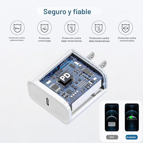 Información del producto: 2 adaptadores de cargador rápido USB C para iPhone + 2 cables USB C a Lightning de dos metros. Estos cargadores rápidos para iPhone cargan tu dispositivo de forma rápida, segura y constante. También ofrecemos un servicio al cliente amigable las 24 horas. No dudes en ponerte en contacto con nosotros, si hay algún problema.