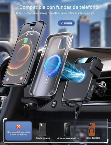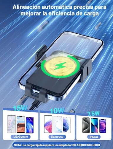 Especificaciones: Cargador inalámbrico para automóvil, soporte de automóvil MOKPR con sujeción automática de 15 W/10 W/7.5 W, carga rápida, ventilación de aire, soporte de teléfono para automóvil, compatible con iPhone