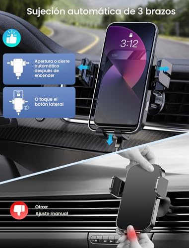 【Sujeción automática inteligente mejorada】Los brazos y el pie del cargador inalámbrico para automóvil se abrirán automáticamente después de conectarse a la alimentación, y se sujetarán automáticamente firmemente una vez que coloques tu teléfono, no es necesario ajustar manualmente el pie para sujetar el teléfono.