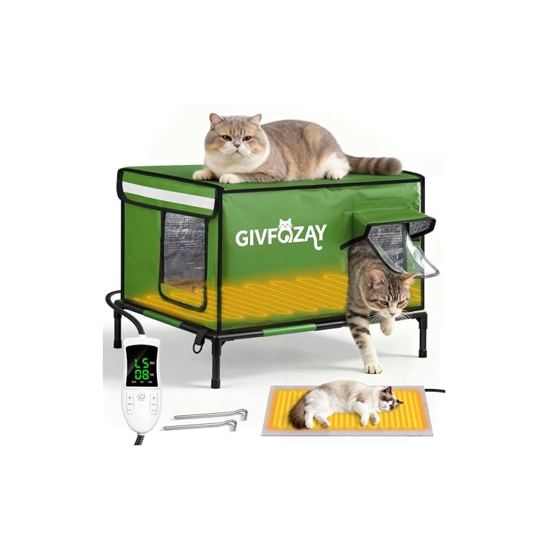 Especificaciones: Casa para gatos con calefacción para uso exterior, tela Oxford 900D, casa exterior para gatos resistente a la intemperie con almohadilla térmica de control remoto, casas aisladas para gatos con pies