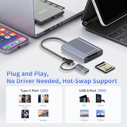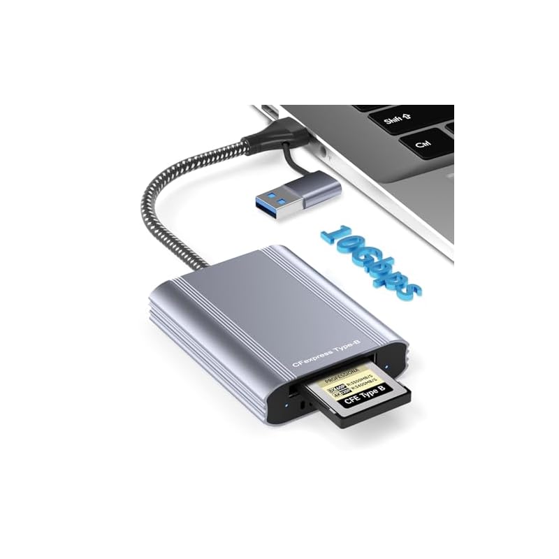 CFexpress – Lector de tarjetas tipo B con USB 3.2 Gen 2 10Gbps y USB-C/USB-A 2 en 1 tipo B adaptador CFexpress, compatible con Windows/Mac/Linux/Android, para iPhone 17/16/15, portátiles, tabletas