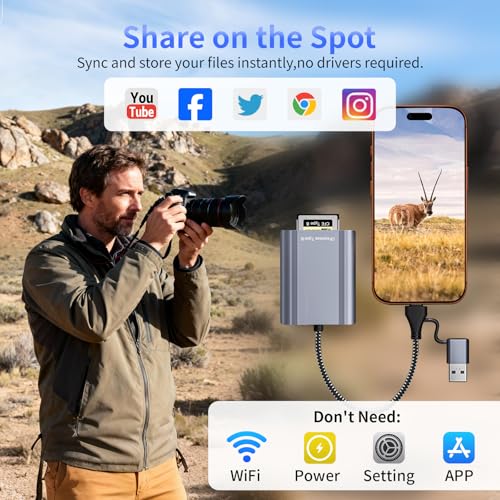 Dual USB-C & USB-A 2-in-1 Connector: Enjoy ultimate connectivity flexibility with the integrated 2-in-1 cable. This cf express type b reader features both a USB-C and a USB-A connector, allowing you to plug seamlessly into modern laptops, tablets, and smartphones or traditional PCs. Please note that the actual achieved speed will depend on the capabilities of your specific devices and memory card.
