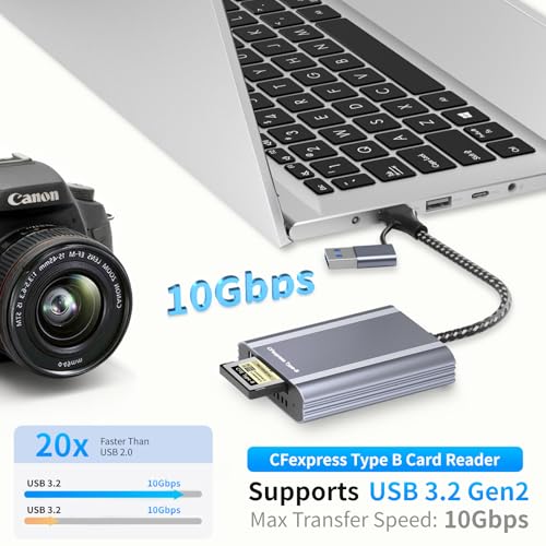 Experience Blazing-Fast 10Gbps Transfers: Unleash the full potential of your CFexpress Type B memory card. Our CFexpress card reader supports USB 3.2 Gen 2 technology, delivering theoretical speeds up to 10Gbps for rapid file transfers. Quickly move high-resolution photos and 8K videos, minimizing your wait time.
