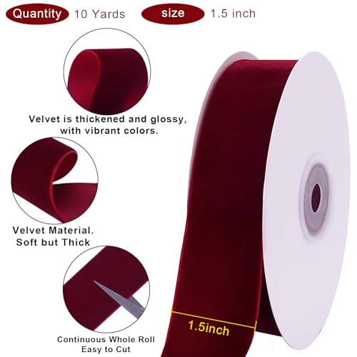 Cinta de terciopelo burdeos de 10 yardas de 1.5 pulgadas para árbol de Navidad, cinta de Navidad de terciopelo para envolver regalos, manualidades, lazo, corona, decoración de vacaciones