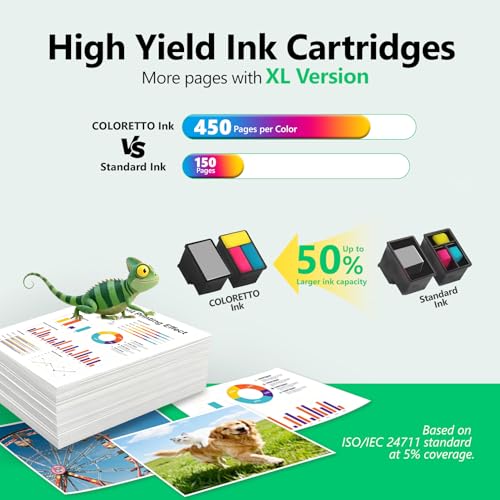 Chip y alto rendimiento de página: la tecnología de chip inteligente permite la lectura del nivel de tinta en tiempo real; cada cartucho de tinta de color COLORETTO 63XL (0.7 fl oz) para tinta HP 63 XL imprime hasta 450 páginas (basado en una cobertura del 5% de papel A4)