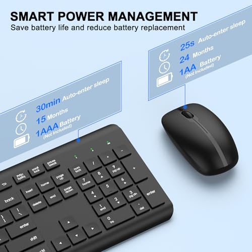 Batería de larga duración: hasta 365 días de duración de la batería para teclado y mouse inalámbricos, di adiós a la molestia de cargar cables y reemplazar las baterías. Después de 10 minutos de inactividad, el combo de teclado y mouse inalámbricos entrará automáticamente en modo de suspensión para ahorrar energía. Cualquier pulsación de botón activará los dispositivos nuevamente. El teclado inalámbrico requiere una batería AAA, y el mouse inalámbrico requiere una batería AA.