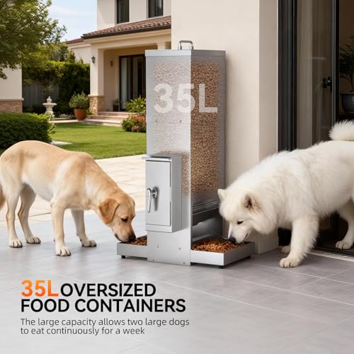 Comedero automático para perros de 35 litros para dos perros o gatos grandes, de acero inoxidable, con temporizador, horario de alimentación, montaje en pared, 2 bandejas extra grandes para
