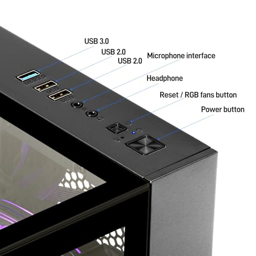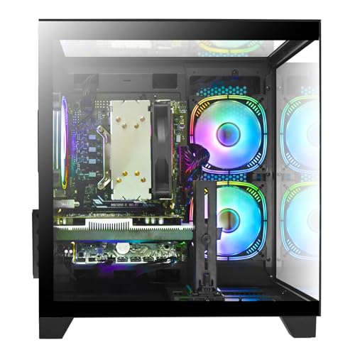 Diseño y extras: El PC está equipado con 3 ventiladores RGB y efectos de iluminación. Estas luces se pueden configurar de acuerdo con las preferencias del usuario, agregando un toque de color a la PC y mejorando el efecto visual general. El chasis está diseñado con panel de vidrio en tres lados, lo que permite a los usuarios visualizar el diseño interno del hardware y los efectos de iluminación. Al mismo tiempo, los paneles laterales de vidrio también garantizan un buen rendimiento de disipación de calor, asegurando que el hardware permanezca estable en un funcionamiento prolongado.