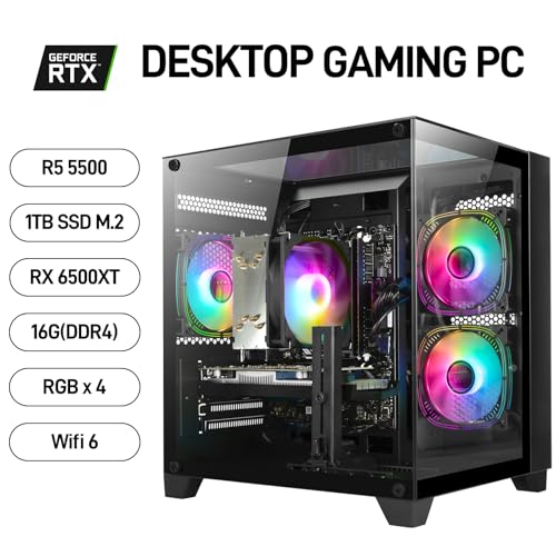 Computadora de escritorio para juegos – Ryzen 5 5500, Radeon RX 6500XT 4GB, 16GB DDR4 RAM, 1TB NVME SSD, computadora torre preconstruida (blanco)