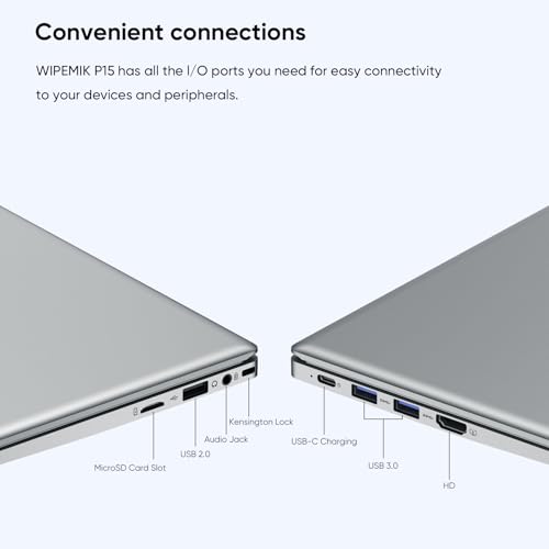 Varias conexiones: la computadora portátil WIPEMIK P15 viene con Wi-Fi 5, perfecta para compartir archivos de alta velocidad y transmisión 4K suave, 1 carga tipo C, 2 USB 3.0, 1 puerto USB 2.0, ranura MicroSD, conector de audio, bloqueo Kensington, tiene todas las conexiones esenciales para mantener tu productividad encendida.