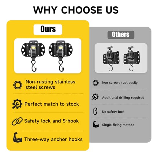 Ajuste perfecto: esta correa de trinquete retráctil está diseñada específicamente para camionetas Ford F150 2015-2025, con agujeros de montaje alineados con láser que garantizan una coincidencia precisa con las posiciones originales del perno del vehículo (no requiere perforación). Nota: Si su F150 fue equipado de fábrica con un enganche tipo caja, este debe retirarse antes de la instalación. Comprueba tu modelo específico y el año antes de comprar.