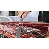 RECOMENDACIONES DE CONSUMO – La paleta se colocará sobre el jamonero y se empezará a cortar en lonchas lo más finas posibles por la zona menos gruesa llamada babilla. Al finalizar cada corte, se cubrirá la zona cortada con el tocino sobrante, evitando así que se reseque y pierda jugosidad. También se debe cubrir toda la paleta para conservarla mejor