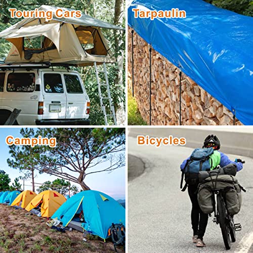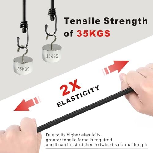Diseño súper resistente: uso duradero y resistente con una capacidad de carga máxima de 66.1 lbs. El material es núcleo de látex completo de alta calidad y cuerda trenzada doble resistente a los rayos UV con alta resistencia a la tracción y mayor resistencia. El gancho de alambre resistente tiene una funda protectora de plástico que no se oxida ni se estira fuera de forma, por lo que es más seguro. El nudo final de la cuerda en el gancho está atado con tratamiento de alta temperatura para evitar que el extremo de la cuerda trenzada se desprenda y se separe.