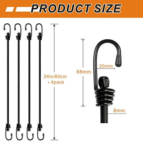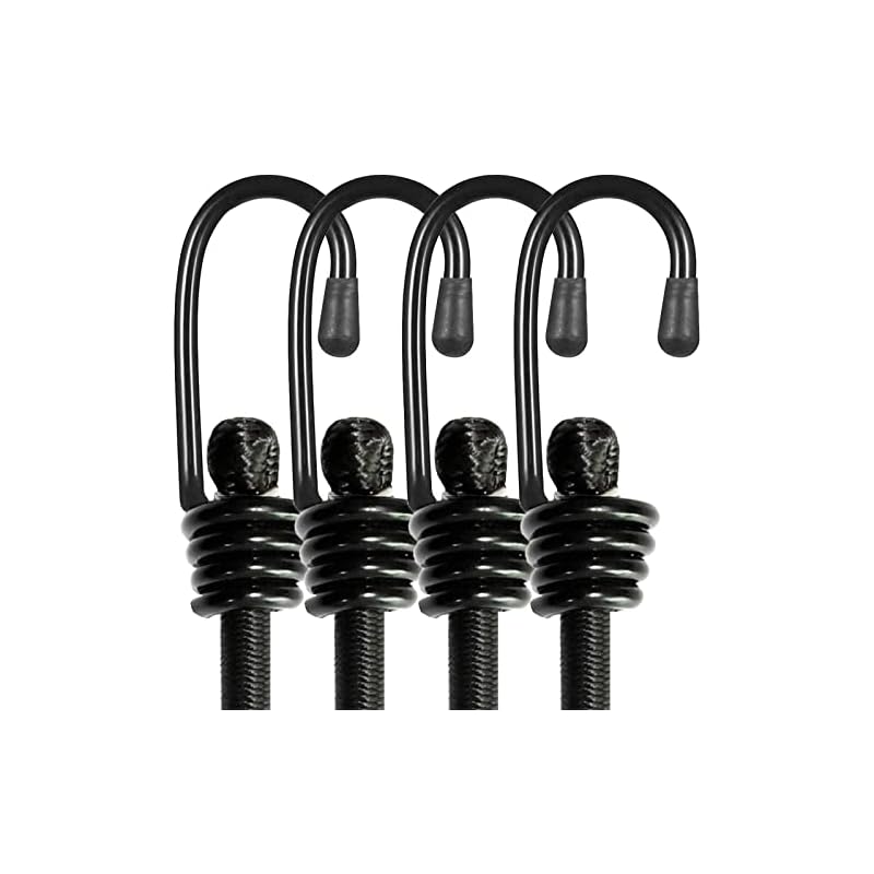 Amplio uso: el cordón elástico negro resistente para exteriores es de 1/3 pulgadas (0.315 in) de diámetro y 24 pulgadas/2 pies de longitud (incluyendo ganchos), 4 piezas, se estira a 40 pulgadas + con gran elasticidad. La banda elástica perfecta para ciclistas, excursionistas, viajes, camping, graneros, jardines y todas las actividades al aire libre. Ayuda con atar, asegurar, llevar, agarrar y más.
