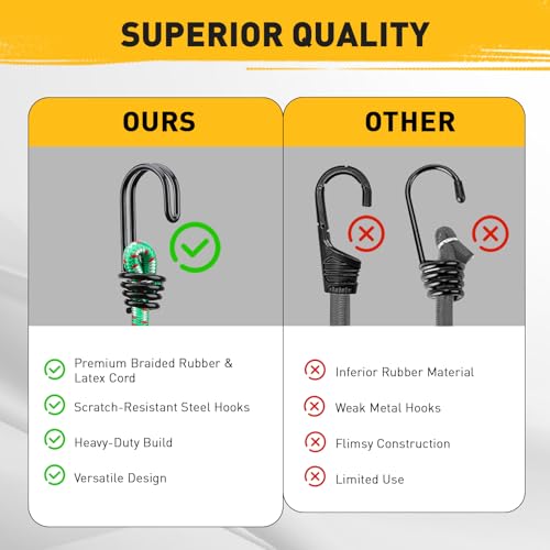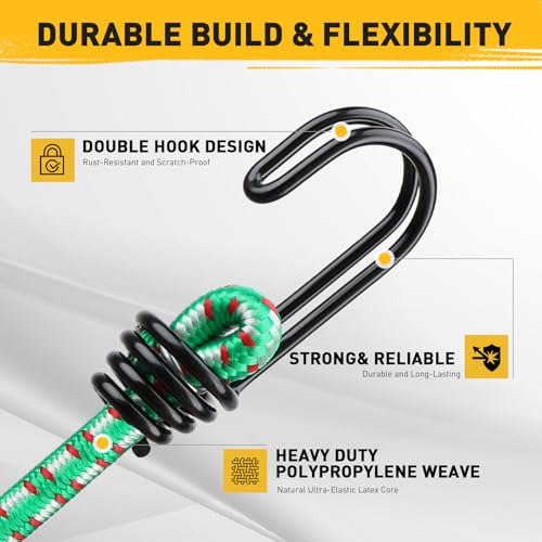 Materiales duraderos: hechos de goma de alta calidad con revestimiento resistente a los rayos UV, estas cuerdas elásticas soportan el sol, la lluvia y los elementos al aire libre. Los ganchos de acero están recubiertos para evitar arañazos y proporcionar una fuerte sujeción.