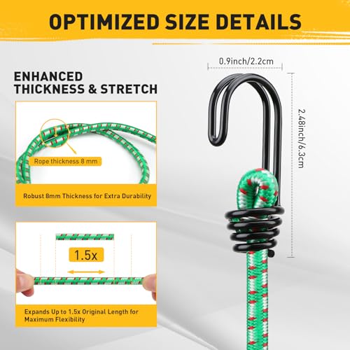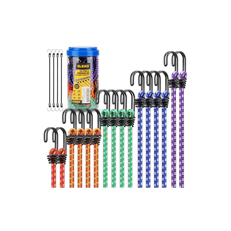Resistente: este juego de cuerdas elásticas resistentes para exteriores incluye 20 cuerdas elásticas de goma de alta calidad con ganchos, diseñadas para asegurar cargas en condiciones adversas. Perfecto para transportar carga, asegurar equipos y aventuras al aire libre.