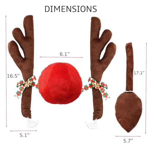 Hermosa decoración navideña de reno para automóvil: difunde la alegría navideña con este divertido y de alta calidad kit de decoración de renos para automóviles. Este accesorio de decoración de vehículo Rudolph viene con 2 cuernos de reno con cascabeles para el techo, 1 nariz roja para la parrilla y 1 cola para la parte trasera de tu automóvil.
