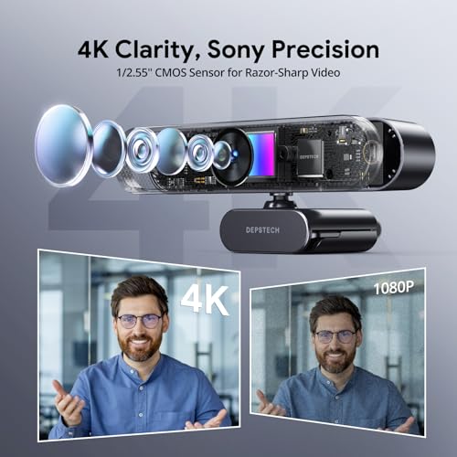 Ultra-HD 4K Webcam Resolution for Stunning Clarity: Capture every detail in true-to-life quality with DEPSTECH 4K webcam, engineered with a 1/2.55” Sony CMOS sensor for 3840×2160 UHD resolution at 30fps. Perfect as a computer camera for desktop, streaming camera 4k, or professional video calls—you’ll always look your best